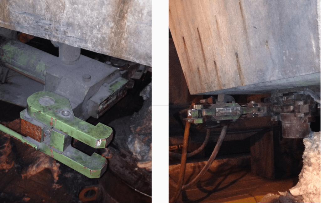 In this setup, the hydraulic cylinder is installed on a heavy-duty support frame beneath the working area. The cylinder operates a hinged clamping arm that engages with the upper mechanism, providing linear motion for positioning, clamping, or actuating a component of the equipment.